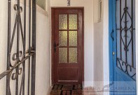Enter through a wooden door to a guest toilet and store room on the left .