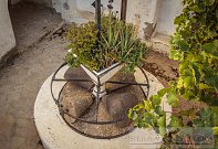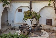 A cluster of apartments surround the old olive press shaded by the grape vines above.